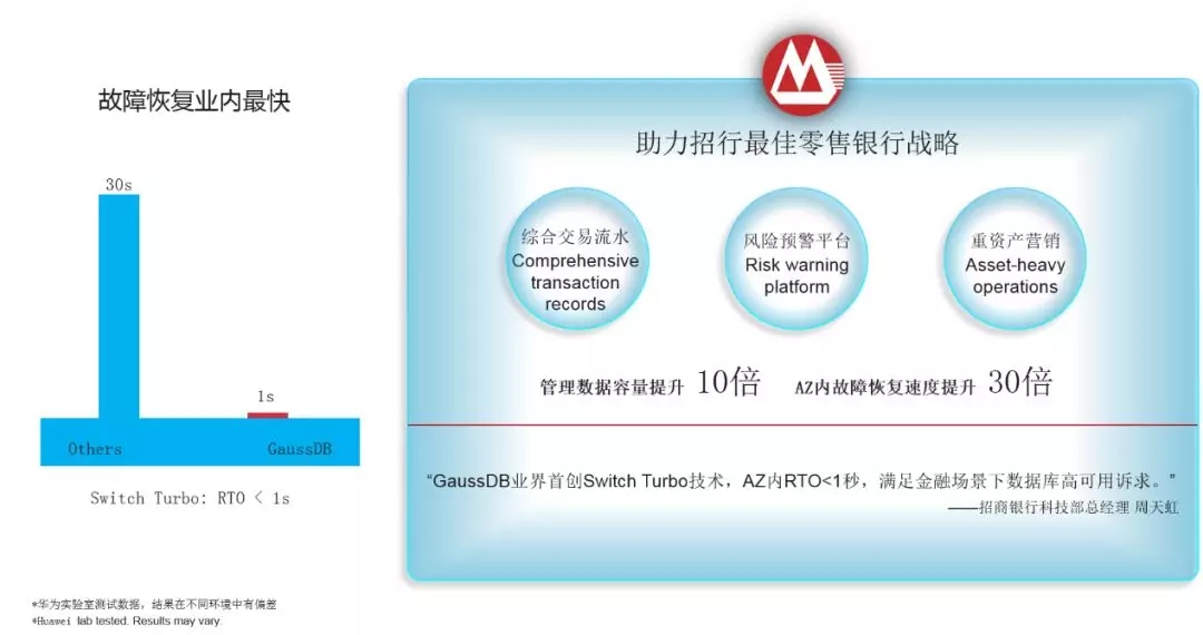 很多银行持续追求三个9甚至五个9,通用数据库通常在保障数据不丢失的情况下,其实是在追求不断降低非计划宕机时间,提升RTO,业界的一个标杆大概做到30秒左右。通过引入Switch Turbo技术,结合全局缓存、高速网络及网络协议创新,GaussDB 在AZ内能做到秒级的RTO。在招商银行的实践中,GaussDB管理的数据容量提升10倍,AZ内故障恢复速度提升30倍。