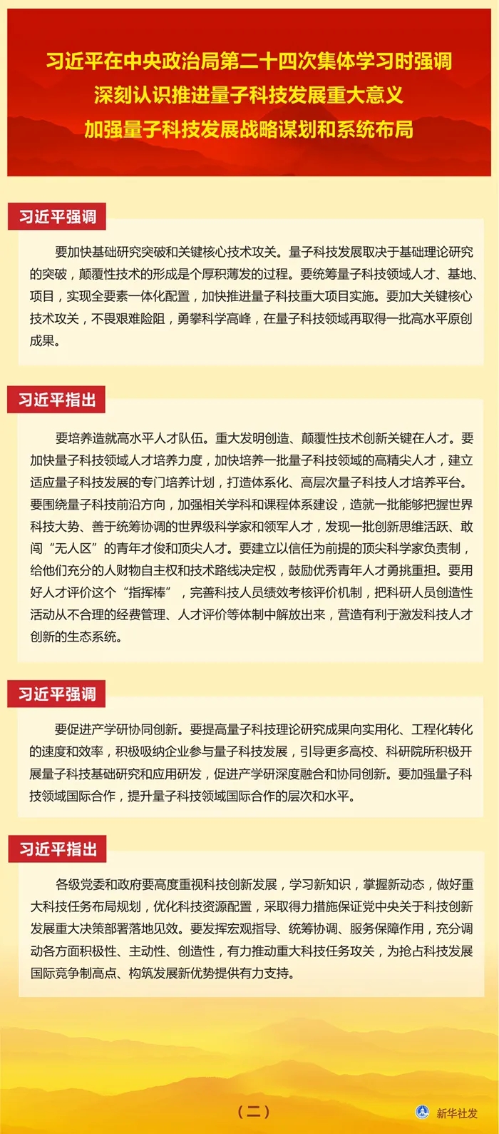 习近平强调,要加快基础研究突破和关键核心技术攻关。量子科技发展取决于基础理论研究的突破,颠覆性技术的形成是个厚积薄发的过程。要统筹量子科技领域人才、基地、项目,实现全要素一体化配置,加快推进量子科技重大项目实施。要加大关键核心技术攻关,不畏艰难险阻,勇攀科学高峰,在量子科技领域再取得一批高水平原创成果。