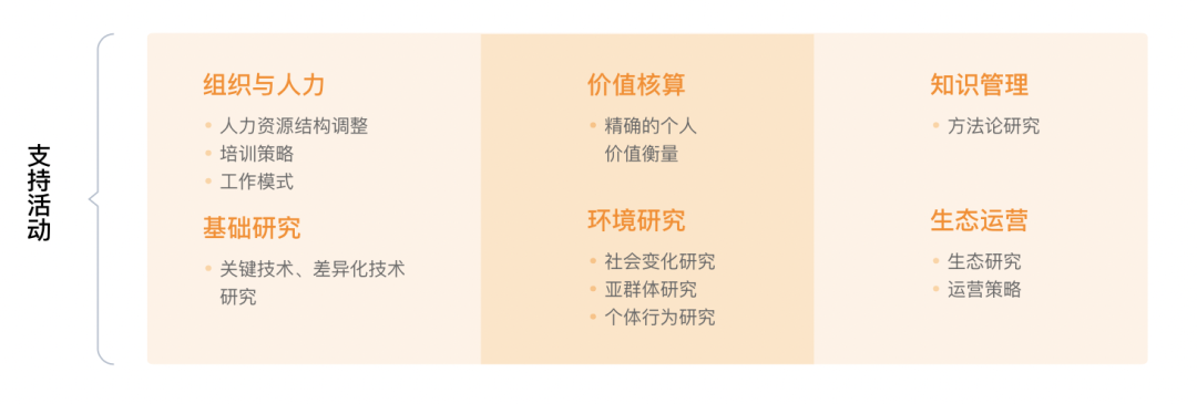 支持活动一般会被当成中后台的工作,不过,数字化企业应该会越来越注重整体敏捷性,而整体敏捷性对中后台的挑战很大。白皮书将支持活动大致分成“基础研究”、“环境研究”、“生态运营”、“知识管理”、“组织和人力”、“价值核算”六个环节,如下图所示: